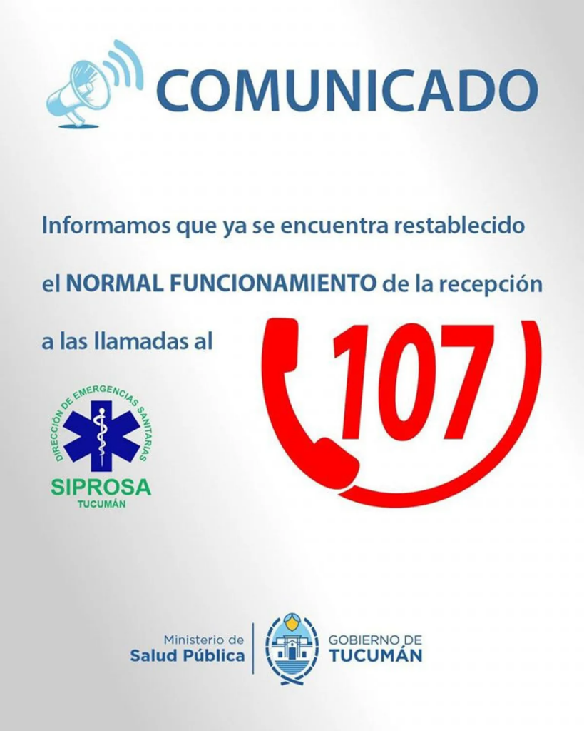 Desde la cartera sanitaria se informó que quedó restablecido el normal funcionamiento de la recepción de llamadas al 107, el servicio de emergencias sanitarias de la provincia. De esta manera, indicaron que el sistema vuelve a operar con normalidad para la atención de urgencias médicas en todo el territorio tucumano.
