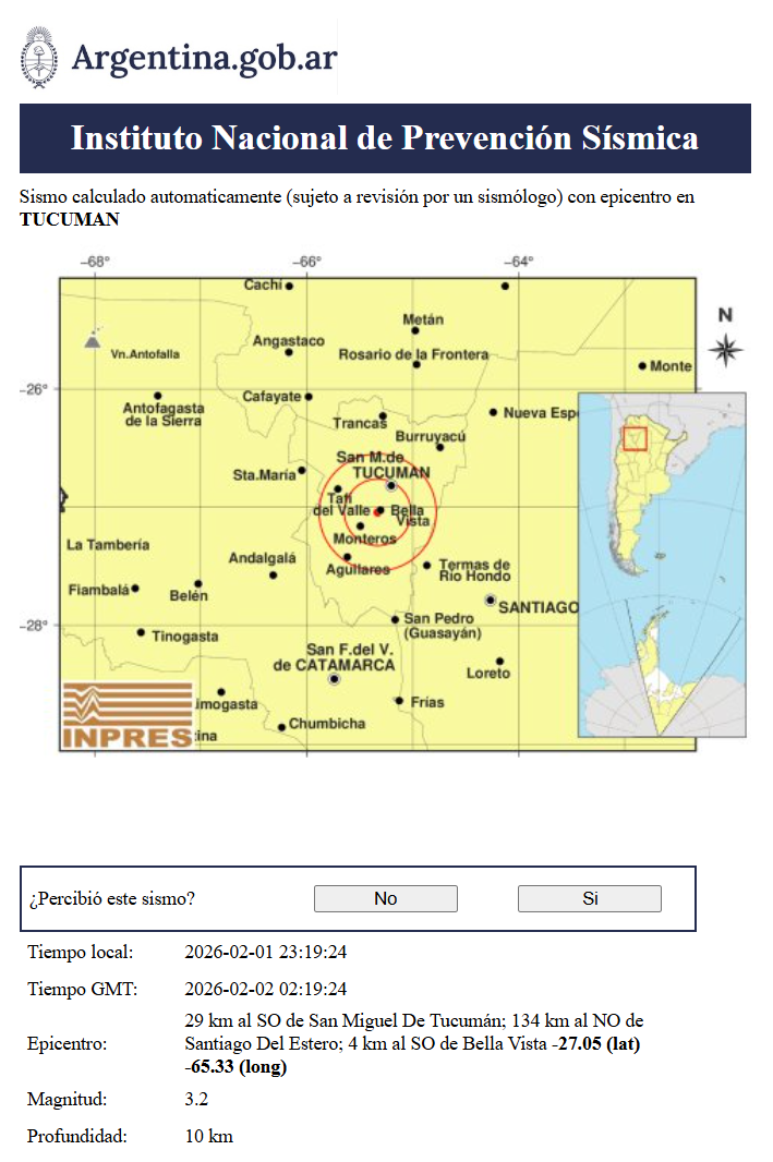 Minutos más tarde, a las 23.19, el organismo nacional confirmó una réplica, también con epicentro en territorio tucumano. Este segundo movimiento alcanzó una magnitud de 3,2, mantuvo la misma profundidad de 10 kilómetros y se localizó a 4 kilómetros al sudoeste de Bella Vista, a 29 km de la capital provincial y a 134 km de Santiago del Estero.