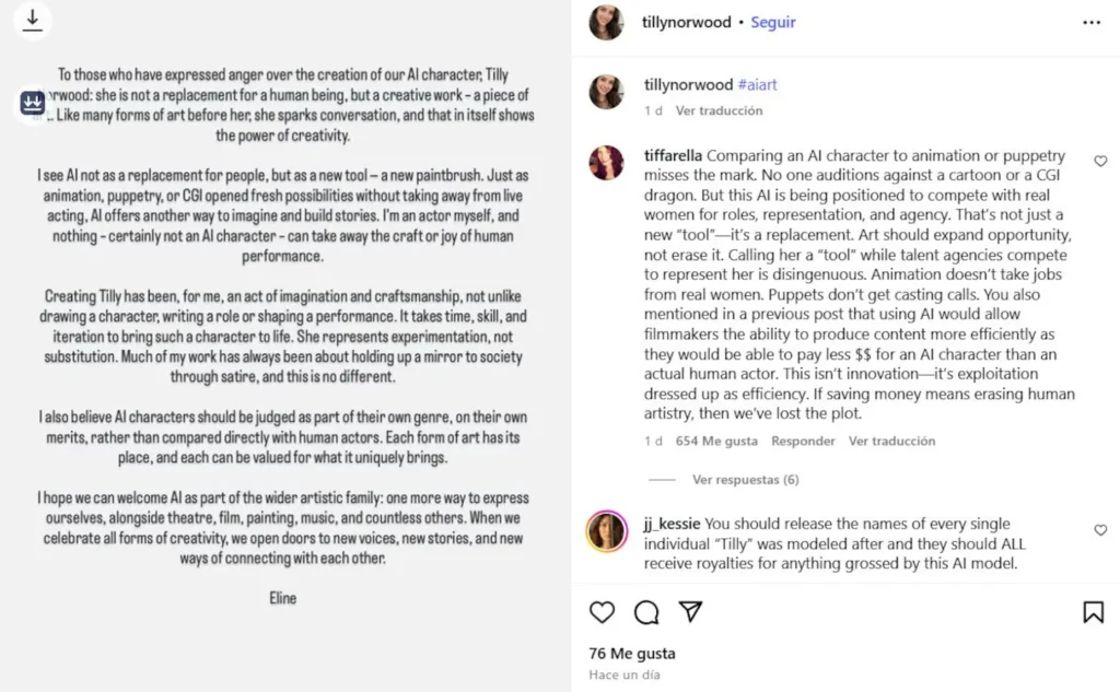 Tras la polémica, Van der Velden publicó un comunicado en el perfil de Instagram de Tilly Norwood. Allí aseguró que su creación “no es un sustituto de un ser humano, sino una obra de arte creativa”.