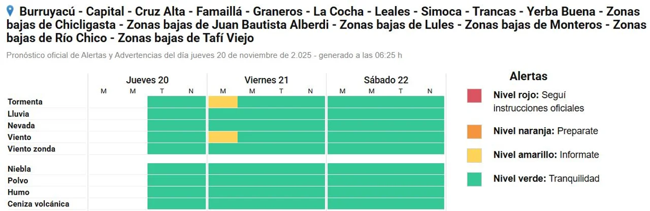 El Servicio Meteorológico Nacional emitió una alerta amarilla por tormentas y vientos en Tucumán. De acuerdo a la información dada a conocer por el organismo, el área será afectada por tormentas aisladas de variada intensidad, algunas localmente fuertes. Las mismas podrían estar acompañadas por lluvias abundantes en períodos cortos, granizo ocasional, ráfagas de hasta 80 km/h y actividad eléctrica frecuente. Se prevén valores de precipitación acumulada entre 20 y 40 mm, pudiendo ser superados en forma puntual.