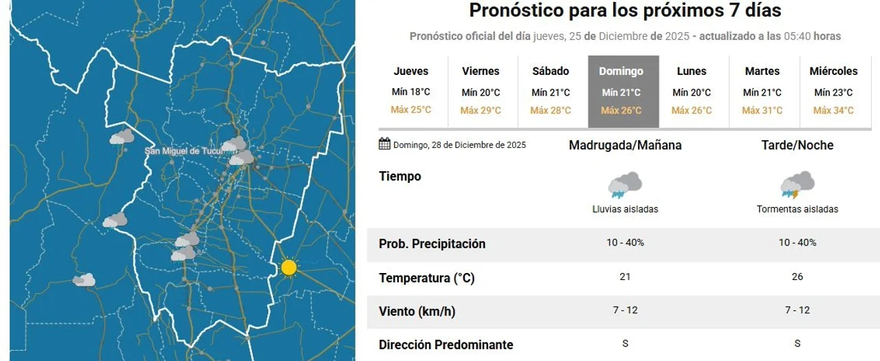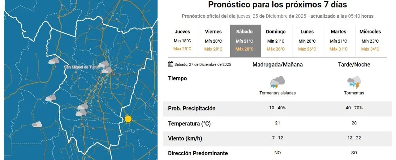 Para el sábado y domingo, el panorama no será muy distinto. El SMN advierte que habrá que planificar actividades bajo techo, ya que se anuncian lluvias y tormentas durante todo el fin de semana. Las temperaturas oscilarán entre 20 grados de mínima y 28 de máxima.