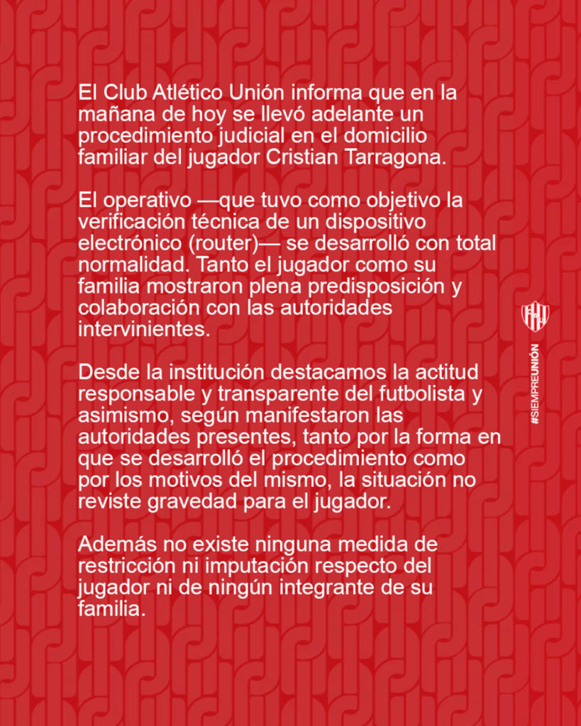 Con esa geolocalización, se empezó a pedir a las empresas que brindan servicios de banda ancha mayores precisiones. El trabajo duró bastantes jornadas, porque lo que se tenía era como si fuera un código postal del que había que sacar luego la dirección precisa. Y el martes la información llegó a la fiscalía del doctor Suasnabar. Con esos datos, determinó que se hicieran los allanamientos esta mañana y para sorpresa de todos, uno de los domicilios donde estaba alojado esa IP era el del futbolista de Unión, Cristian Tarragona. El delantero, de 34 años, llegó en junio de este año para jugar en el Tatengue, donde se convirtió en el máximo goleador del equipo con cuatro tantos.