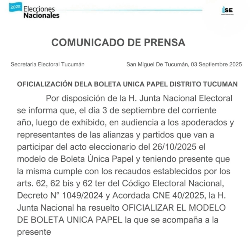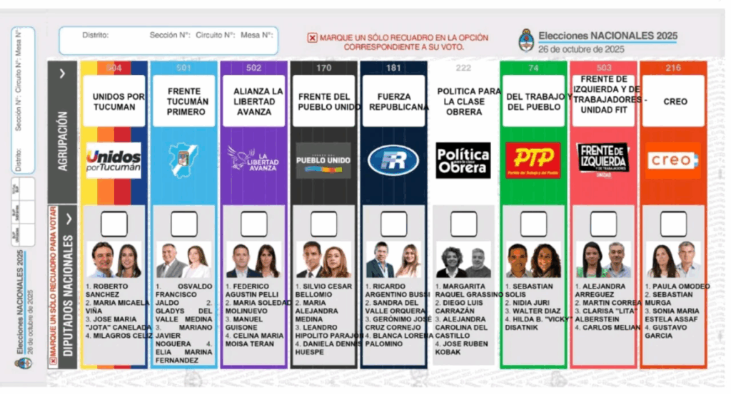 Desde la Secretaría Electoral de Tucumán, mediante un comunicado oficial, informaron que quedó oficializado el modelo de la Boleta Única de Papel para las elecciones legislativas nacionales del próximo domingo 26 de octubre.