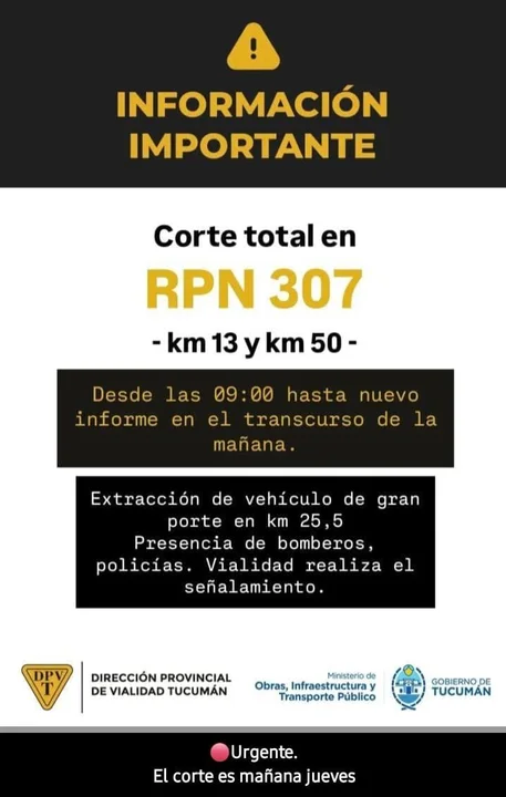 Desde la Dirección Provincial de Vialidad informaron sobre un corte total de la ruta provincial 307 para este jueves desde las 09:00 horas en el tramo que comprende los kilómetros 13 al 50.