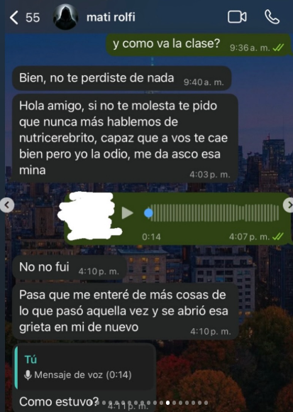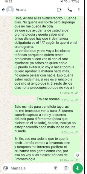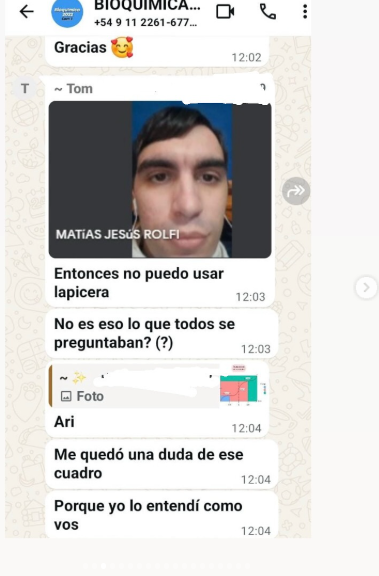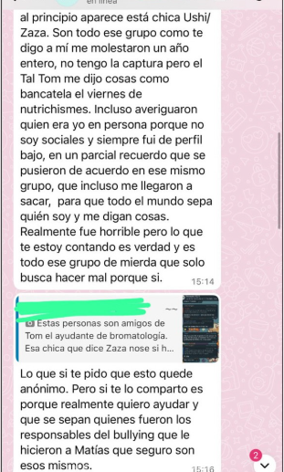 En grupos como “Fisiología 2025” y “Bioquímica”, Matías fue blanco de burlas y comentarios despectivos. Cuando expresó que un examen sería más difícil que el anterior, una compañera lo cruzó con dureza: “¡Es un examen nada más! ¡Basta!”. En otro grupo, alguien escribió: “Algún día a ese chico le va a tocar un profesor sin paciencia y lo va a sacar de la clase, jajajaja”.