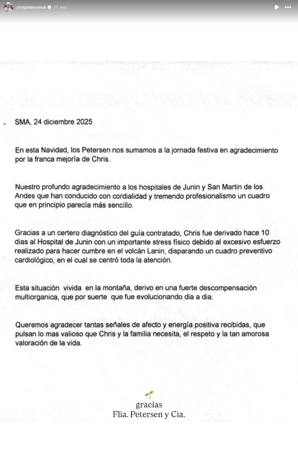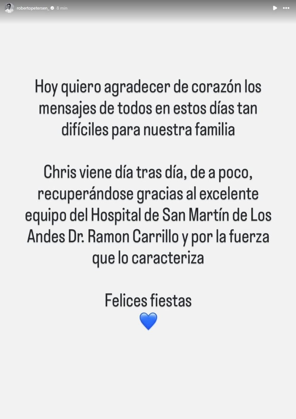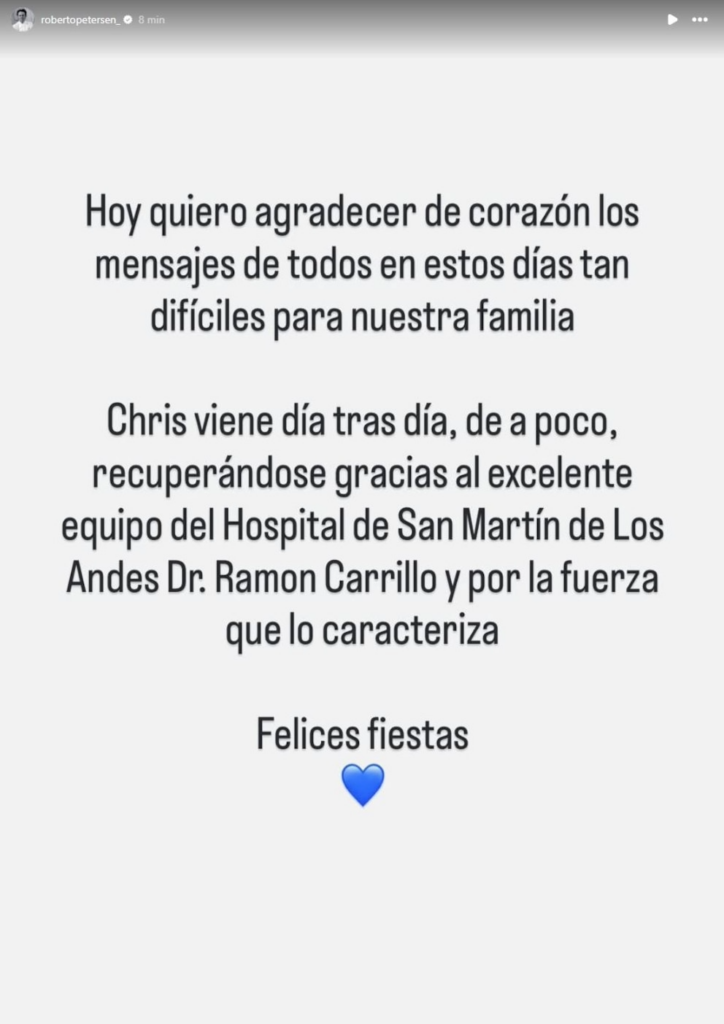 En la previa de Navidad, la familia de Petersen compartió un mensaje en redes sociales donde destacó una evolución favorable y agradeció el accionar del personal de salud: