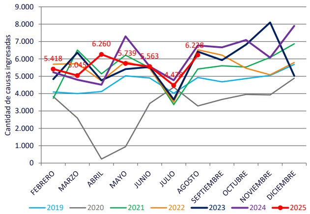 El informe también muestra un fuerte incremento en las causas ingresadas a unidades no penales: 30.087 expedientes fueron iniciados entre febrero y agosto de este año, lo que supone un crecimiento interanual del 27% frente a 2024 (23.632) y del 43% en comparación con 2023 (25.120).