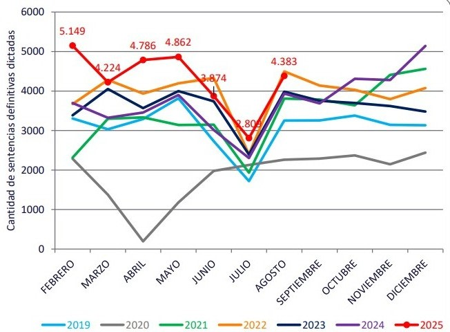 Los números reflejan una tendencia sostenida de crecimiento en las resoluciones definitivas: en 2019 se habían dictado 21.154 sentencias, mientras que en 2020, año de fuerte impacto por la pandemia, la cifra se redujo a 11.410. Sin embargo, a partir de 2021 comenzó una recuperación que se consolidó en 2022 con 27.319 sentencias, y que alcanzó su pico este año con más de 30 mil resoluciones.