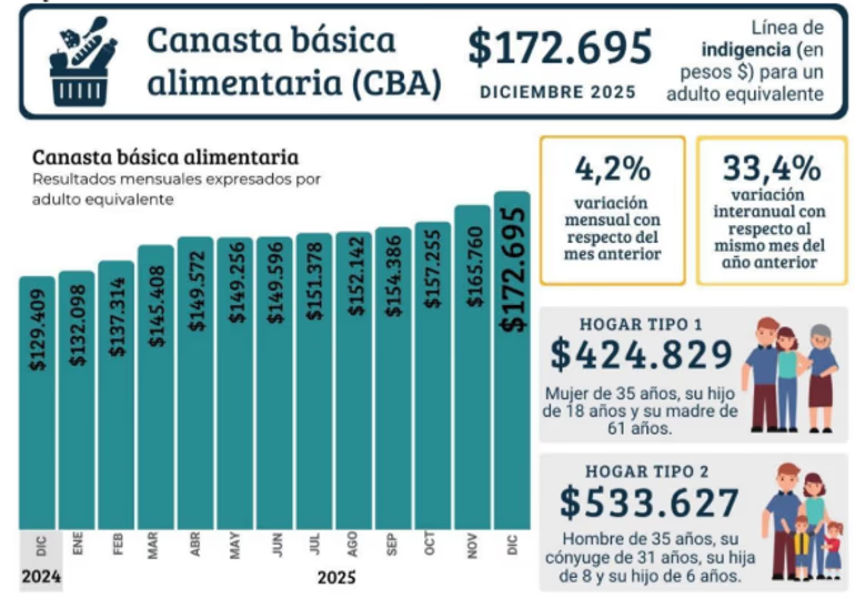 Según el informe, en diciembre la CBA registró una variación mensual de 4,2% respecto de noviembre, mientras que la CBT creció 3,1% en el mismo período. Con esos valores, un adulto equivalente —definido como varón adulto, entre 30 y 60 años, de actividad moderada— requirió $172.695 para no ser considerado indigente. Para no estar en situación de pobreza, ese mismo adulto necesitó $350.332.