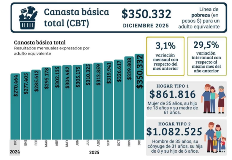 Un hogar tipo 2 —compuesto por un jefe de 35 años, su cónyuge de 31 años, una hija de 8 y un hijo de 6— precisó un ingreso superior a $533.627 (CBA) para no ser considerado indigente, y $1.082.525 (CBT) para no caer en situación de pobreza. Respecto a la variación interanual acumulada durante 2025, la CBA aumentó 33,4% y la CBT 29,5% en comparación con el mismo mes del año anterior.