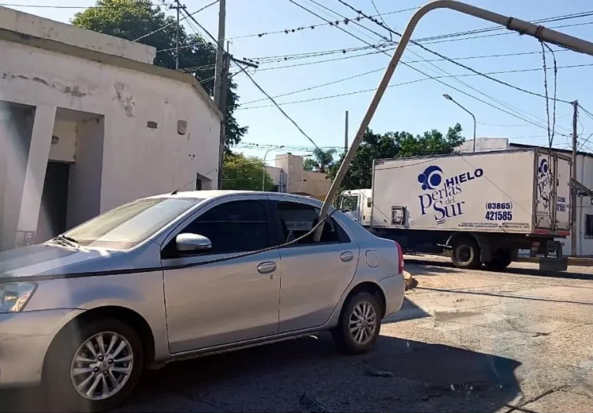 La escena se volvió aún más impactante cuando el poste metálico se desplomó sobre un automóvil Toyota que estaba estacionado en la calle 9 de Julio. La estructura terminó incrustada en la parte trasera del vehículo, que por fortuna no tenía ocupantes al momento del incidente.