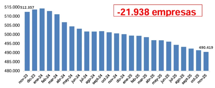 La diferencia implica la desaparición de 21.938 empresas en dos años, lo que equivale a un promedio de 30 cierres por día. Solo en noviembre de 2025 se contabilizaron 892 empleadores menos, y el acumulado de los primeros once meses del año arroja una pérdida neta de 9.722 firmas.