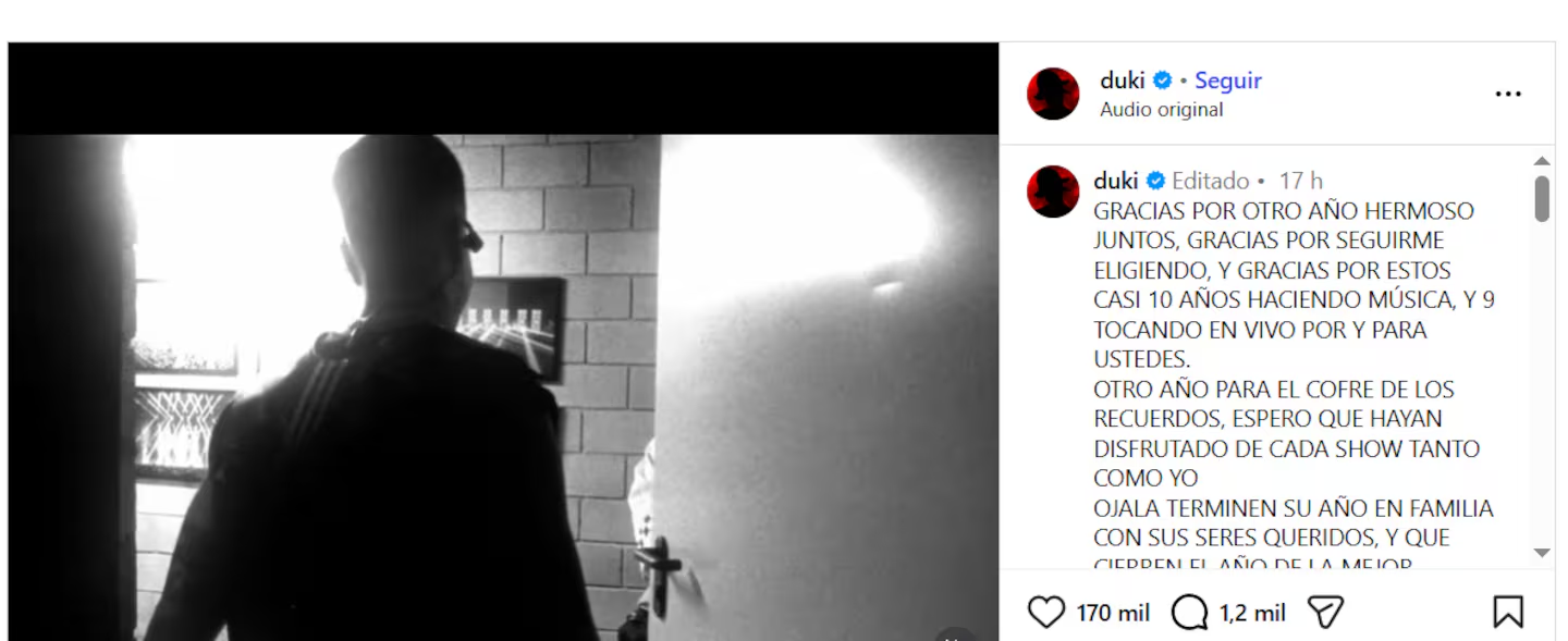 En las últimas horas, Duki anunció que se toma un descanso de la música, luego de una década de trayectoria. “Gracias por otro año hermoso juntos, gracias por seguirme eligiendo, y gracias por estos casi 10 años haciendo música, y 9 tocando en vivo por y para ustedes”, arrancó Mauro Lombardo, su nombre real, en su cuenta de Instagram.