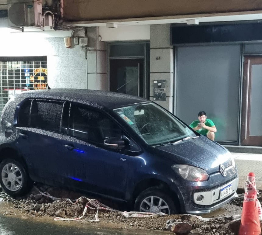 El vehículo quedó con su parte delantera hundida dentro del pozo, en un sector donde se observaba agua acumulada, material removido y señalización colocada por la empresa. A pesar del impacto, el conductor no habría sufrido lesiones, aunque el auto quedó atrapado a la espera de asistencia mecánica.