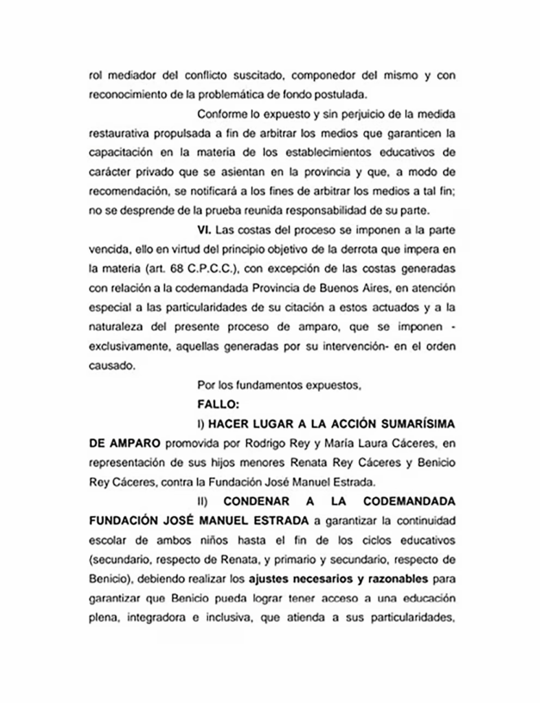 El caso se judicializó. Y la familia Rey obtuvo una medida cautelar provisoria a su favor, que aseguraba la matrícula escolar de sus hijos, Benicio -diagnosticado con Trastorno del Espectro Autista (TEA)- y Renata, para el ciclo lectivo 2025 en el Estrada de City Bell, hasta que se expida la justicia.