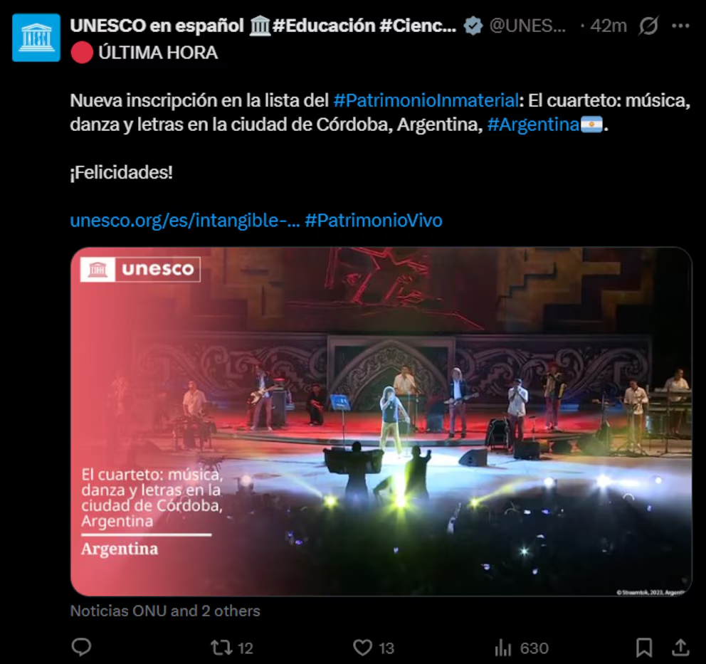 «Ultima Hora. Nueva inscripción en la lista de Patrimonio Inmaterial: el cuarteto, música, danza y letras en la ciudad de Córdoba, Argentina. ¡Felicidades!», dice el anuncio de la Organización de las Naciones Unidas para la Educación, la Ciencia y la Cultura.