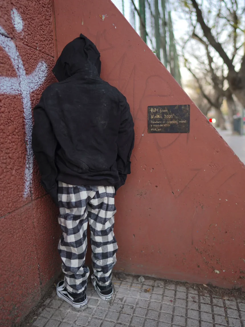 La figura de un niño encapuchado, sin rostro ni nombre, apareció en Fitz Roy al 1900, pleno Palermo Hollywood. La instalación es obra del artista urbano Sebastián Andreatta, conocido como BIH, quien decidió usar el espacio público para denunciar la vulnerabilidad infantil. La obra, moldeada en cemento a partir de un maniquí, representa a un niño castigado contra la pared. Fue colocada en septiembre y ya sufrió dos actos de vandalismo.