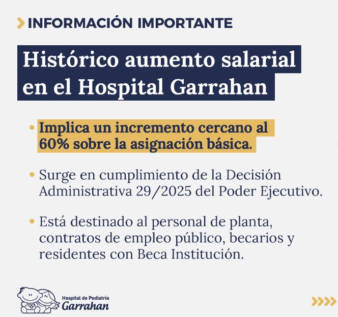 El Hospital Garrahan consolidó un importante avance en materia salarial para su personal al implementar un aumento del 61% en la asignación básica destinado a empleados de planta, contratados bajo empleo público, becarios y residentes con Beca Institución.
