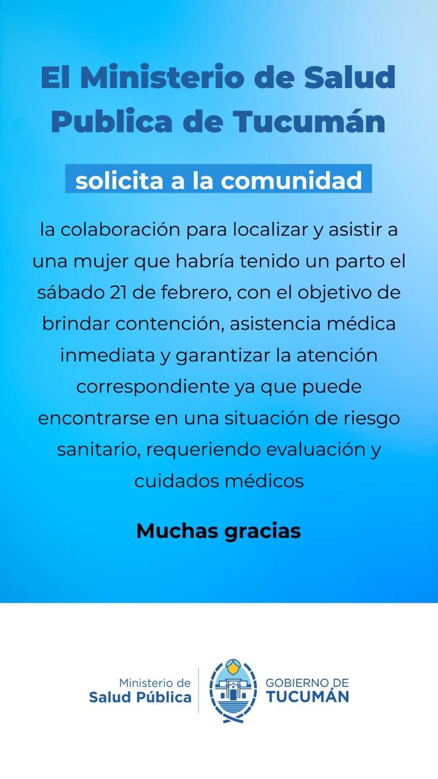 El Ministerio de Salud Pública de Tucumán lanzó un pedido de colaboración a la comunidad para dar con el paradero de una mujer que habría dado a luz el pasado sábado 21 de febrero en inmediaciones de la Ruta Provincial 302, a la altura de Delfín Gallo.