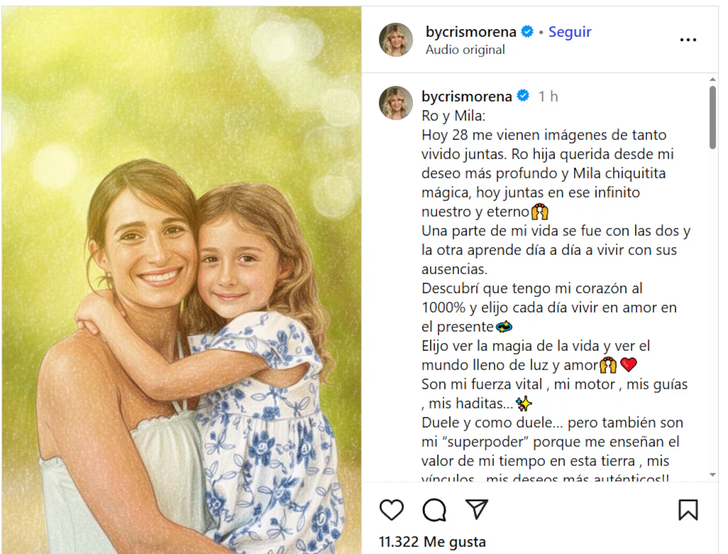 Sobre cómo la afecta la ausencia tanto de Romina como de Mila, dijo: “Duele y cómo duele… Pero también son mi súperpoder porque me enseñan el valor de mi tiempo en esta tierra, mis vínculos, mis deseos más auténticos».