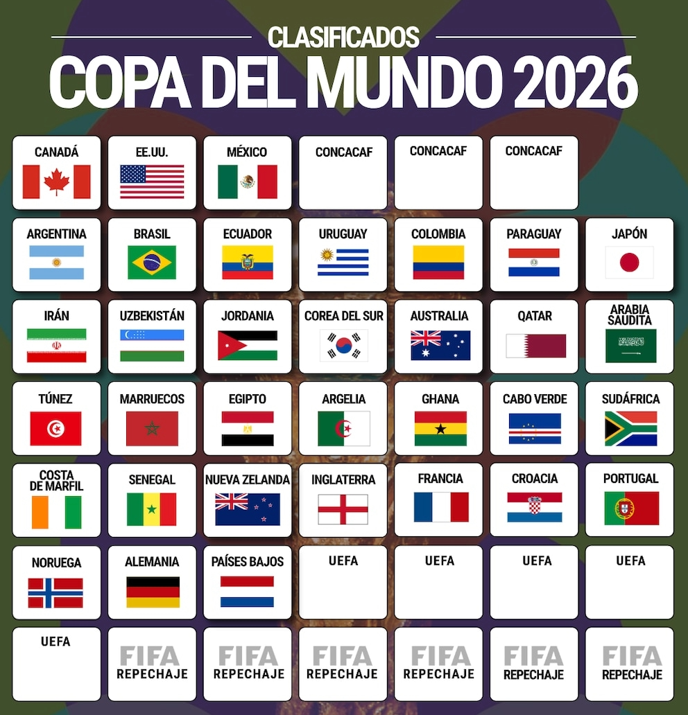 Los ganadores de estas repescas se sumarán a los 42 equipos ya clasificados. El sorteo de la fase de grupos del Mundial 2026 se realizará el próximo viernes 5 de diciembre en Washington DC.