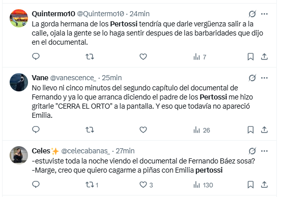 El estreno del documental “50 segundos: el caso de Fernando Báez Sosa” en Netflix volvió a poner en el centro de la escena a Emilia Pertossi Cinalli, hermana de Ciro y Luciano Pertossi y prima de Lucas Pertossi y Blas Cinalli. Su testimonio en defensa de sus familiares generó un intenso debate en redes sociales y la convirtió rápidamente en tendencia.