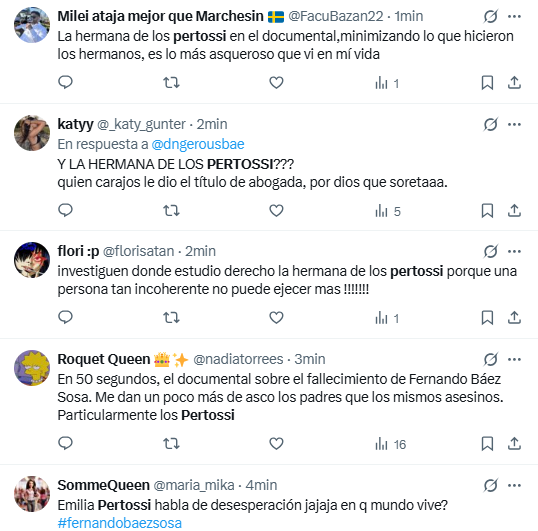 Sus palabras despertaron críticas en redes sociales, donde muchos usuarios consideraron que sus declaraciones podían interpretarse como una relativización del sufrimiento de la familia Báez Sosa. Las reacciones se multiplicaron luego de que la joven apareciera varias veces en pantalla, lo que incrementó la exposición pública de su postura.