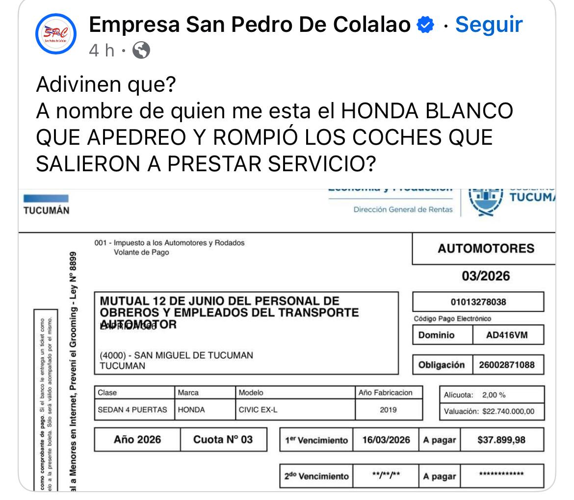 En medio de una jornada de alta tensión, la Empresa San Pedro de Colalao lanzó una durísima denuncia pública contra el gremio de la UTA, acusándolos de utilizar una «patota sindical» para impedir la salida de sus unidades. Con videos y fotos como prueba, la firma expuso ataques con piedras y bloqueos en las rutas, asegurando que el sindicato busca vulnerar la libertad de trabajo mediante la violencia.