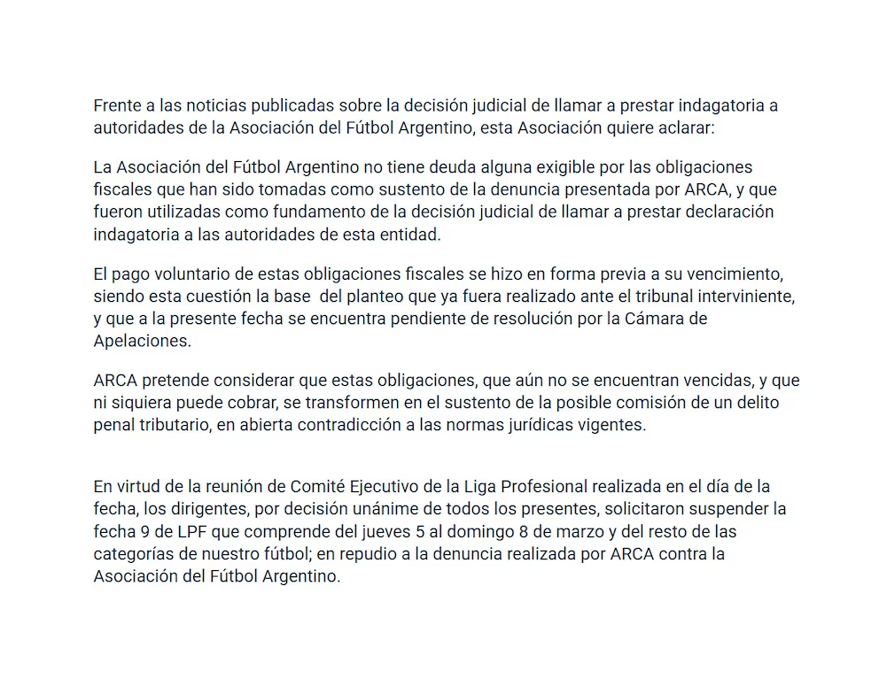 Los clubes de Primera División resolvieron convocar a un paro de todas las categorías del fútbol argentino los días 5, 6, 7 y 8 de marzo. La medida se decidió en una reunión del Comité Ejecutivo de la Asociación del Fútbol Argentino (AFA), donde los dirigentes expresaron su rechazo ante las recientes denuncias del ARCA vinculadas a cuestiones tributarias y manifestaron su apoyo a la conducción de la entidad.