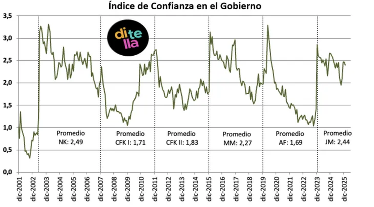 Por edades, el grupo de 18 a 29 años conserva el nivel más elevado de confianza (2,70), mientras que el segmento de 30 a 49 años continúa siendo el más crítico (2,17). Entre los mayores de 50 años se registró, incluso, una leve mejora mensual