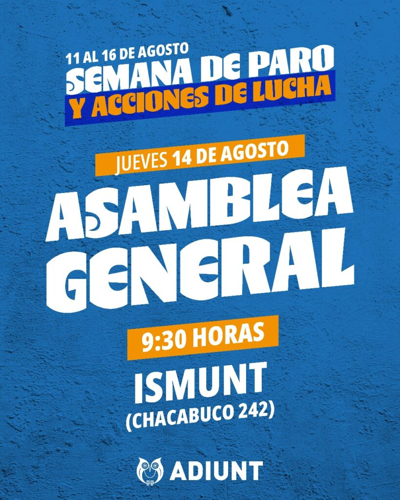 En el marco de la Semana de Paro Nacional de la docencia universitaria, convocamos a todas y todos los docentes a participar de la Asamblea General que se realizará el jueves 14 de agosto a las 9:30 horas en el ISMUNT (Chacabuco 242).