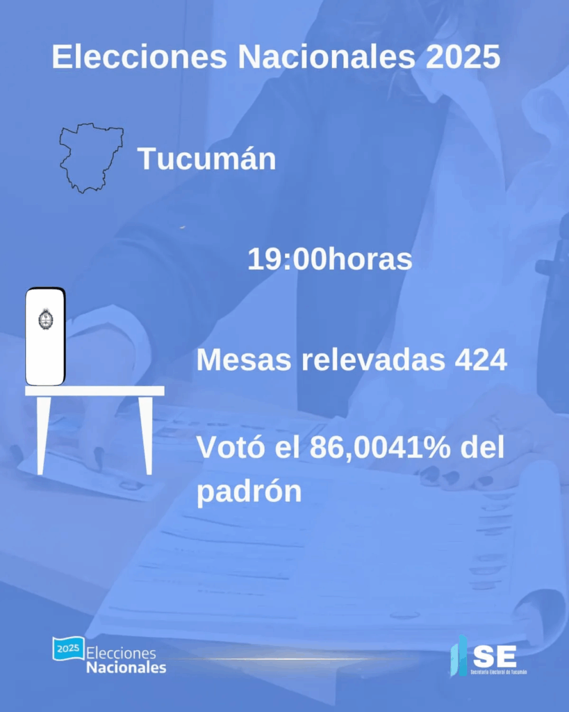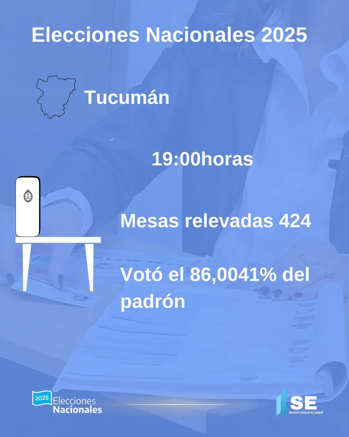 Respecto a la participación de los tucumanos, desde la Secretaría Electoral informaron que hasta las 19:00 horas, votó el 86,41% del padrón electoral habilitado. Se trata de unas 424 mesas relevadas.