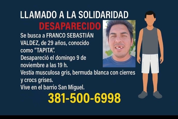«Tapita» como lo conocen, desapareció el domingo 9 de noviembre a las 19 horas. Vestía una musculosa gris, bermuda blanca con cierres y unas crocs de color gris. El joven reside en el Barrio San Miguel.