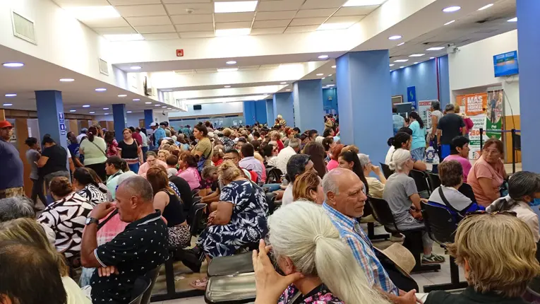 “Está lleno y no hay empleados para atender”, relató uno de los usuarios. Minutos después, otro testimonio reforzó la queja: “Hay mucha gente grande esperando desde hace más de dos horas”. Las imágenes enviadas por lectores a la redacción muestran un salón colapsado, con la mayoría de los asientos ocupados por adultos mayores visiblemente cansados por la demora.
