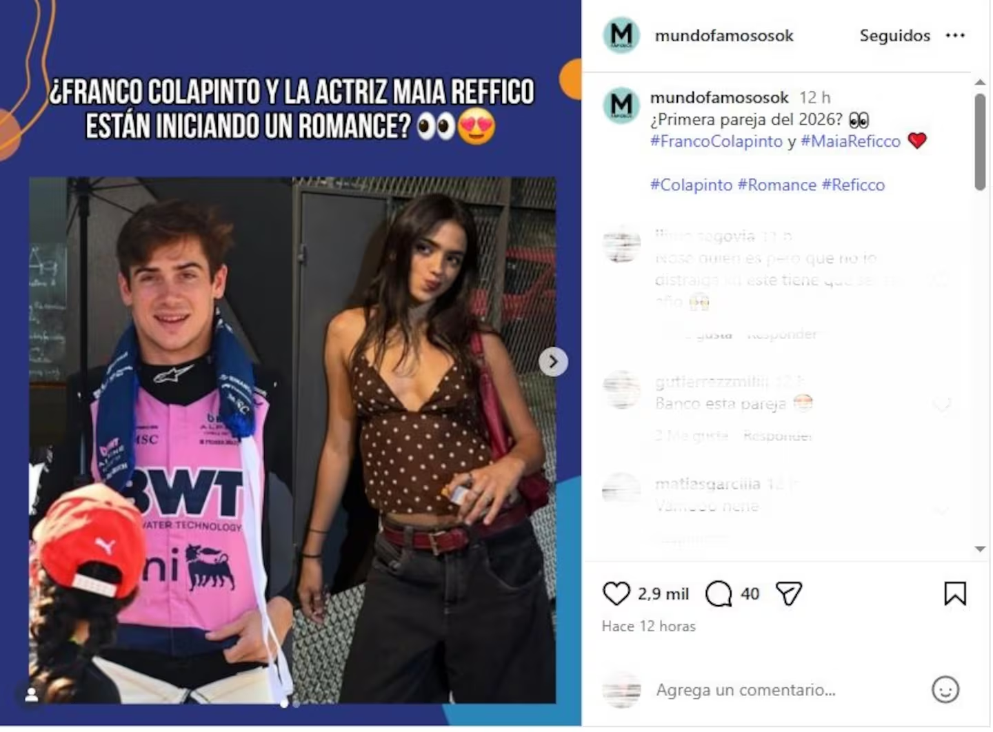 Todo comenzó cuando el piloto argentino subió una imagen que no pasó desapercibida. En la foto se ve a una joven con casco de automovilismo, y los seguidores no tardaron en identificarla como Maia Reficco, la actriz de carrera internacional que triunfa en el exterior.
