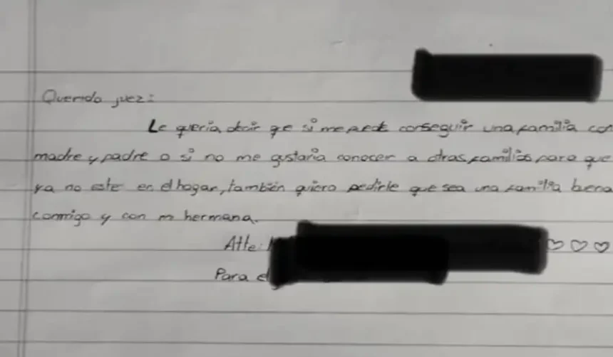 Su hermana mayor, de 12 años, también expresó su deseo más profundo: dejar el hogar y ser adoptadas juntas. “Me gustaría una familia con mamá y papá, pero si no, conocer otras familias. Lo importante es que sea buena conmigo y con mi hermana”, escribió, dejando en claro que el amor es más importante que la forma.