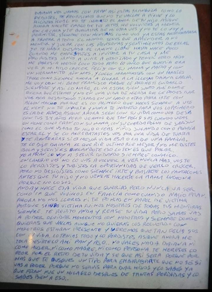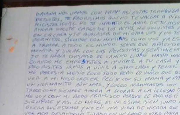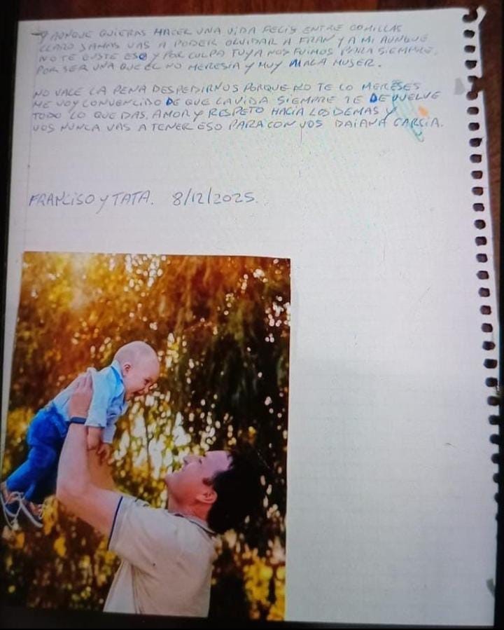 La macabra carta que escribió el hombre a mano anunciaba lo que sucedería horas después: «Daiana, nos vamos con Fran así estás tranquila. Te propusimos que no te fueras y lo hiciste igual. No te importó el amor de tu hijo, así que ahora hacete cargo de tus actos«.