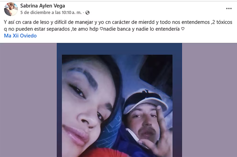 La víctima fue identificada como Sabrina Aylen Vega, quien era madre de una niña y había dejado pistas públicas sobre la relación tóxica que vivía con Maximiliano Oviedo, su novio ahora arrestado. Justo antes del siniestro final, la joven había posteado una foto con él que decía: “Y así con cara de leso y difícil de manejar y yo con carácter de mierda y todo nos entendemos. 2 tóxicos que no pueden estar separados. Te amo hdp, nadie banca y nadie lo entendería”.