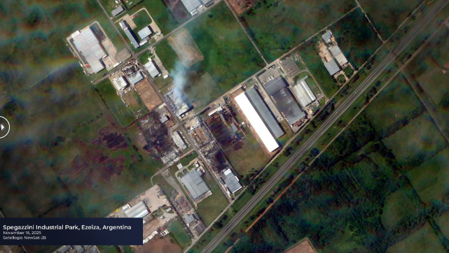 Las imágenes satelitales captadas por Satellogic permiten dimensionar el alcance del devastador incendio que se desató el viernes por la noche en el Polígono Industrial de Ezeiza. El material aéreo muestra el antes y el después de la explosión en el parque Carlos Spegazzini, donde el fuego arrasó depósitos, fábricas y generó una columna de humo visible desde Caballito, Palermo y Belgrano.
