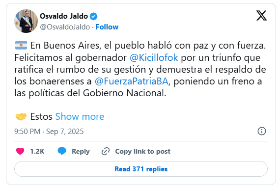 A través de su cuenta oficial de X, el gobernador, Osvaldo Jaldo, se pronunció sobre las elecciones bonaerenses en donde el peronismo alcanzó una victoria contundente sobre la Libertad Avanza.
