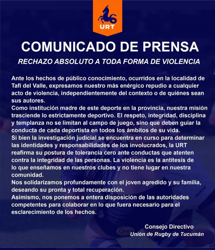 A través de un comunicado, la URT expresó su «rechazo absoluto a toda forma de violencia». Este hecho involucra a un jugador del club Huirapuca. Además, la víctima pertenece a Universitario.