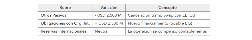El balance del BCRA correspondiente a la última semana de diciembre reveló un movimiento de USD 2.500 millones. El Gobierno utilizó estos fondos para devolver la parte ejecutada del swap de USD 20.000 millones que había acordado con Washington antes de las elecciones legislativas. Para realizar este pago sin afectar las reservas internacionales, se tomó un crédito de monto equivalente con un organismo internacional.