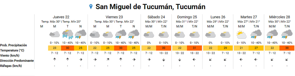 - Viernes 23: Cielos despejados a parcialmente nublados. Lluvias débiles y aisladas en la noche. Máximas de 30°
