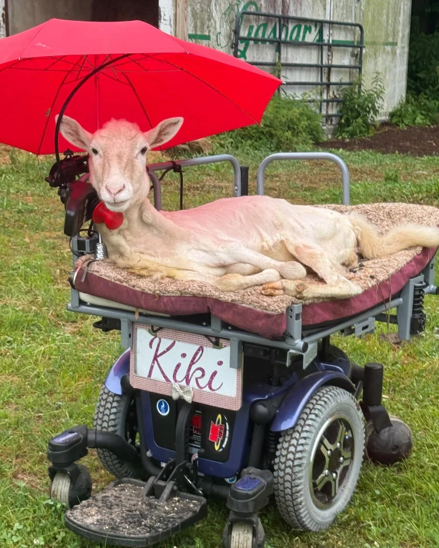 Kiki es una oveja nacida con discapacidad en una granja de Massachusetts. Su madre contrajo el virus del Valle de Cache durante el embarazo, lo que provocó malformaciones en su cría: articulaciones fusionadas y problemas en la columna. Incapaz de caminar, fue rechazada al nacer. La granja contactó al santuario Don’t Forget Us, Pet Us, en Dartmouth, donde Kerry Devlin, su cofundadora, la recibió con apenas 11 días de vida.