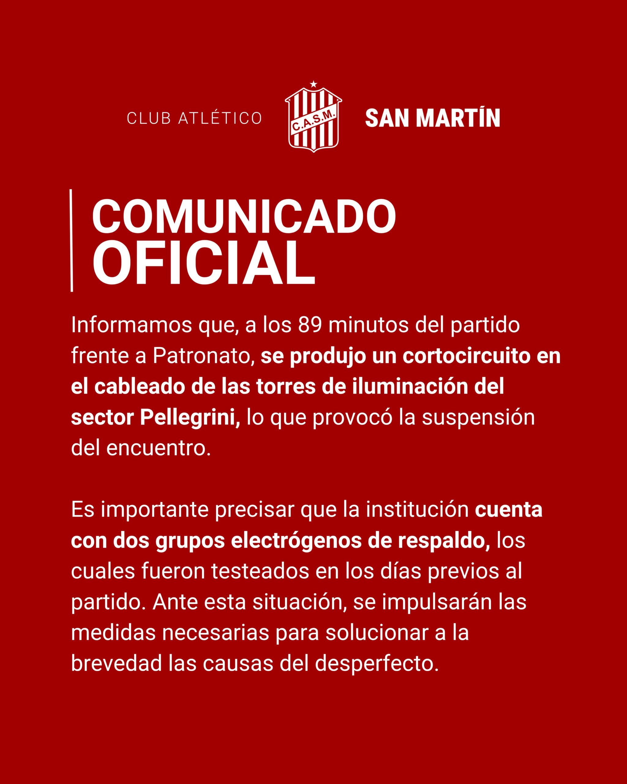 — Primera Nacional (@Primeranaciona) February 16, 2026 Desde la institución emitieron un comunicado oficial en el que informaron que “se produjo un cortocircuito en el cableado de las torres de iluminación del sector Pellegrini”, lo que provocó la suspensión del partido. Además, aclararon que el club cuenta con dos grupos electrógenos de respaldo, los cuales habían sido testeados en los días previos al encuentro. Según precisaron, se impulsarán las medidas necesarias para solucionar a la brevedad las causas del desperfecto.
