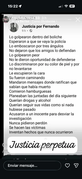 La madre de Fernando Báez Sosa, el joven de 18 años asesinado por un grupo de rugbiers en la ciudad balnearia de Villa Gesell, publicó una historia en su cuenta de Instagram donde apuntó contra los autores del crimen al sostener que “no le dieron la oportunidad” a su hijo de “defenderse”.