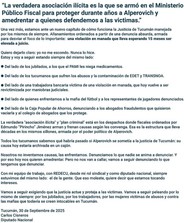Según Cisneros, la verdadera asociación ilícita opera desde los despachos del Ministerio Público Fiscal, donde —según él— se encubrieron durante años causas como la de José Alperovich. El legislador nacional peronista calificó los allanamientos en su contra como “absurdos” y parte de una maniobra para desviar el foco de una “violación en manada que lleva 15 meses sin ser elevada a juicio”.