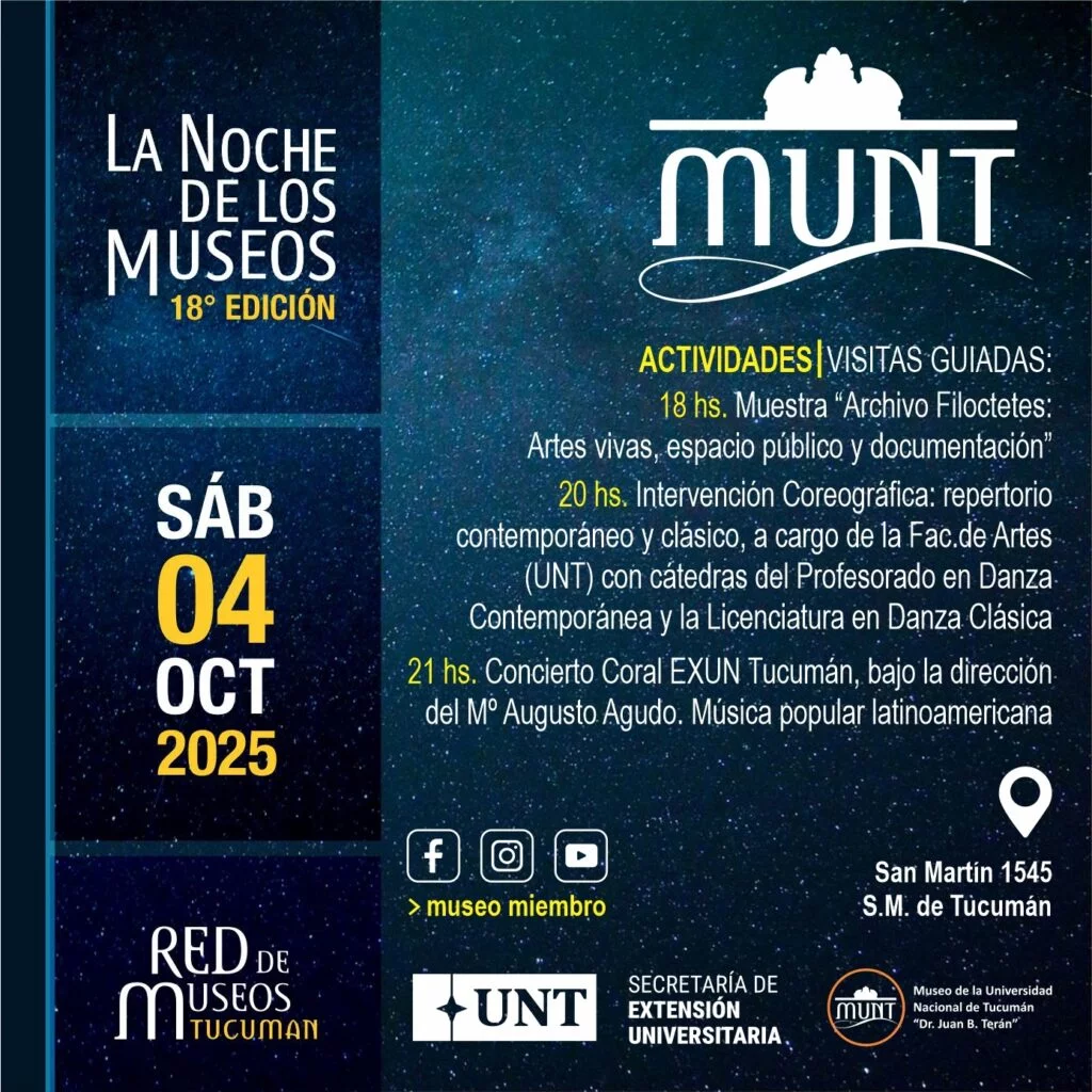La presencia de la UNT en la Noche de los Museos es de gran valor, permite que la comunidad conozca y acceda al vasto patrimonio científico, artístico, arqueológico e histórico que resguarda la Universidad. Con más de un siglo de historia, la institución no solo abre sus colecciones, sino que también muestra el trabajo académico y de investigación que se produce en sus aulas y laboratorios.