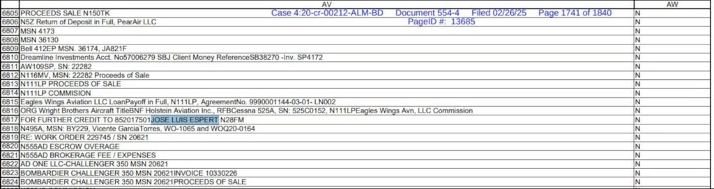 La transferencia, fechada el 22 de enero de 2020, se realizó antes de que Machado fuera detenido y está asociada a la matrícula N28FM, el avión privado que Espert usó durante su campaña presidencial de 2019. El piloto Axel Vugdelija confirmó que el diputado voló “dos o tres veces” en esa aeronave, propiedad de Med Aviation.