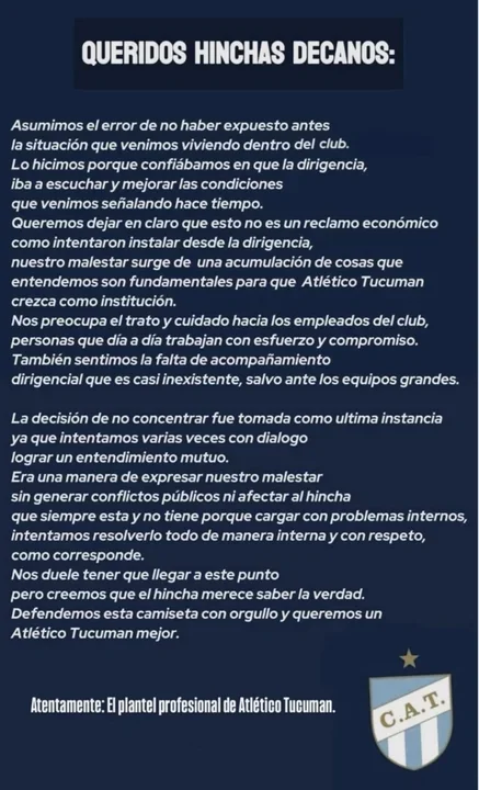 El Decano viene atravesando momentos de tensión desde la semana pasada cuando los jugadores decidieron no concentrarse en la previa del partido ante San Lorenzo. La situación se profundizó luego de la derrota ante el Ciclón el lunes pasado en el José Fierro, donde los hinchas hicieron saber su malestar con los futbolistas.